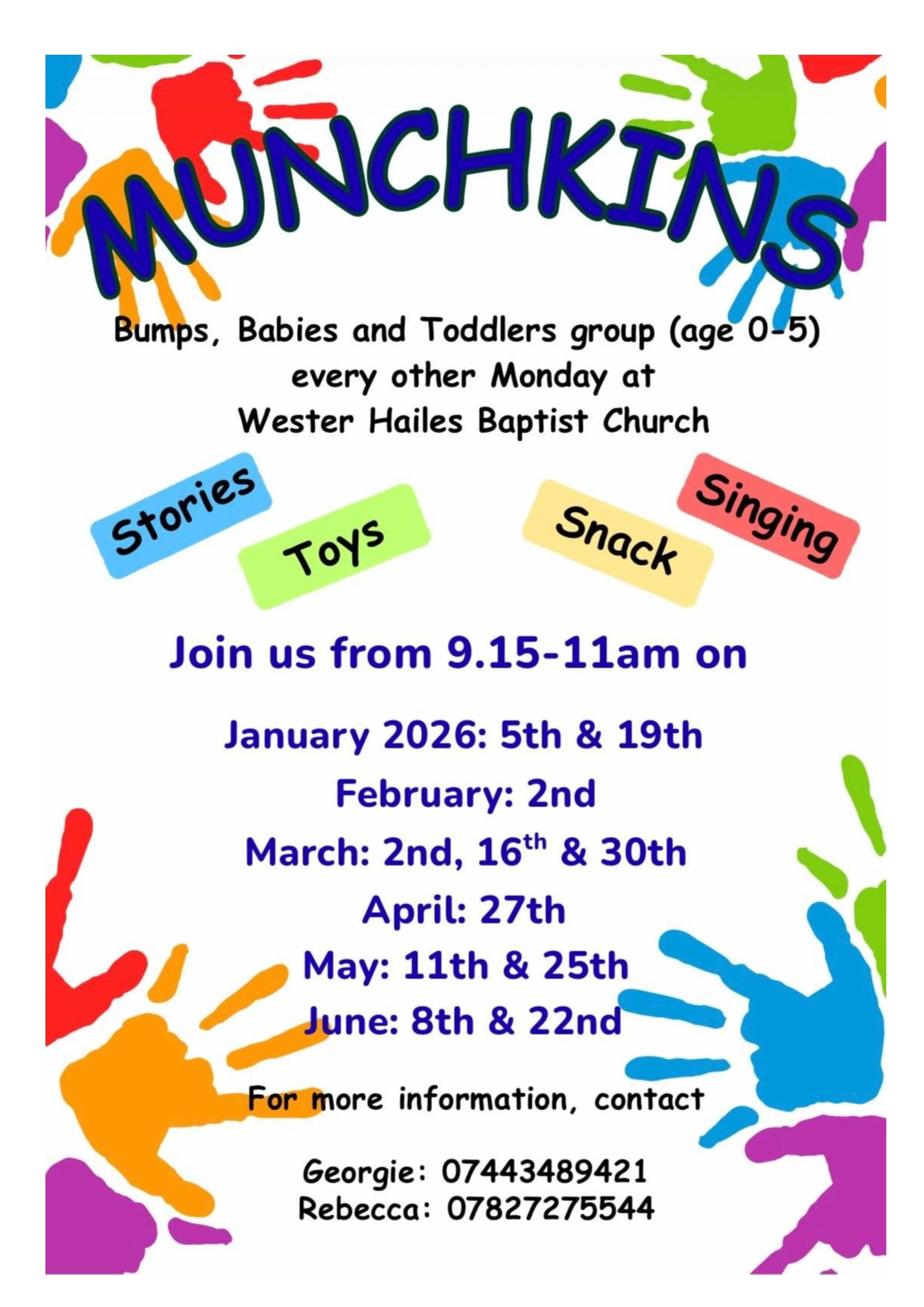We’re a friendly group that meets at Wester Hailes Baptist Church, where parents, carers, and grandparents can enjoy special time with their little ones (ages 0-5). Each week, we have fun making crafts, singing songs, and sharing stories—all in a relaxed and welcoming space. Plus, there’s always a chance to catch up with other grown-ups over some yummy refreshments!